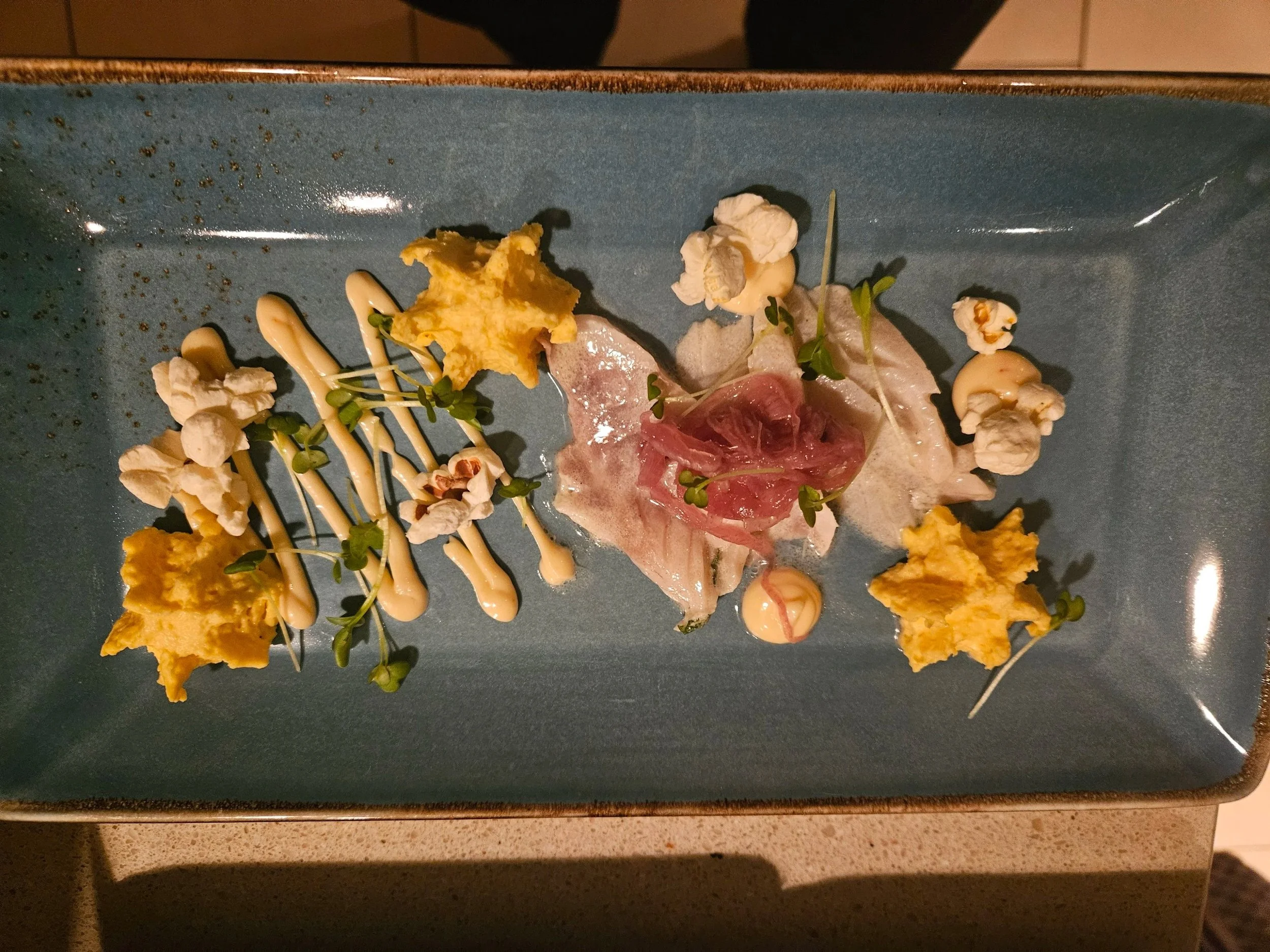 Ceviche vom Wolfsbarsch | Limette | rote Zwiebeln | Minze | Mais – Espuma | Popcorn | Chili – Mayonnaise